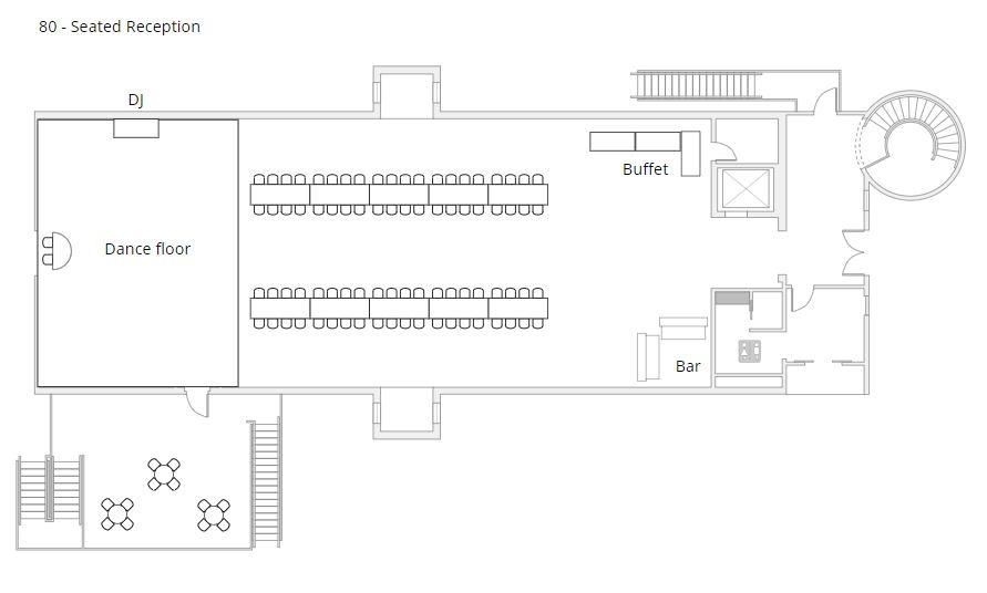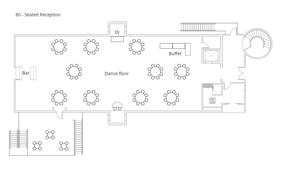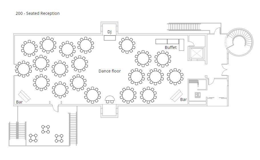 - (24) 66″ round tables seating 8-10 guests each
